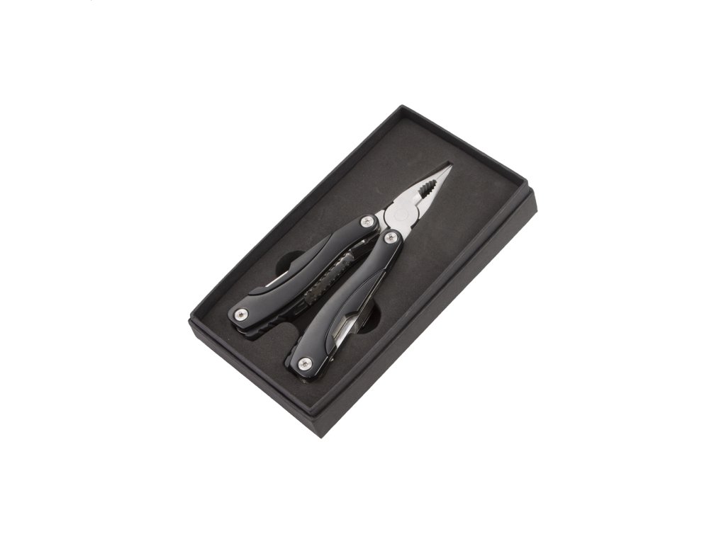 Nerezové multifunkčné kliešte s hliníkovou rukoväťou a 8 funkciami. V čiernej darčekovej krabičke.Dodatočné parametre