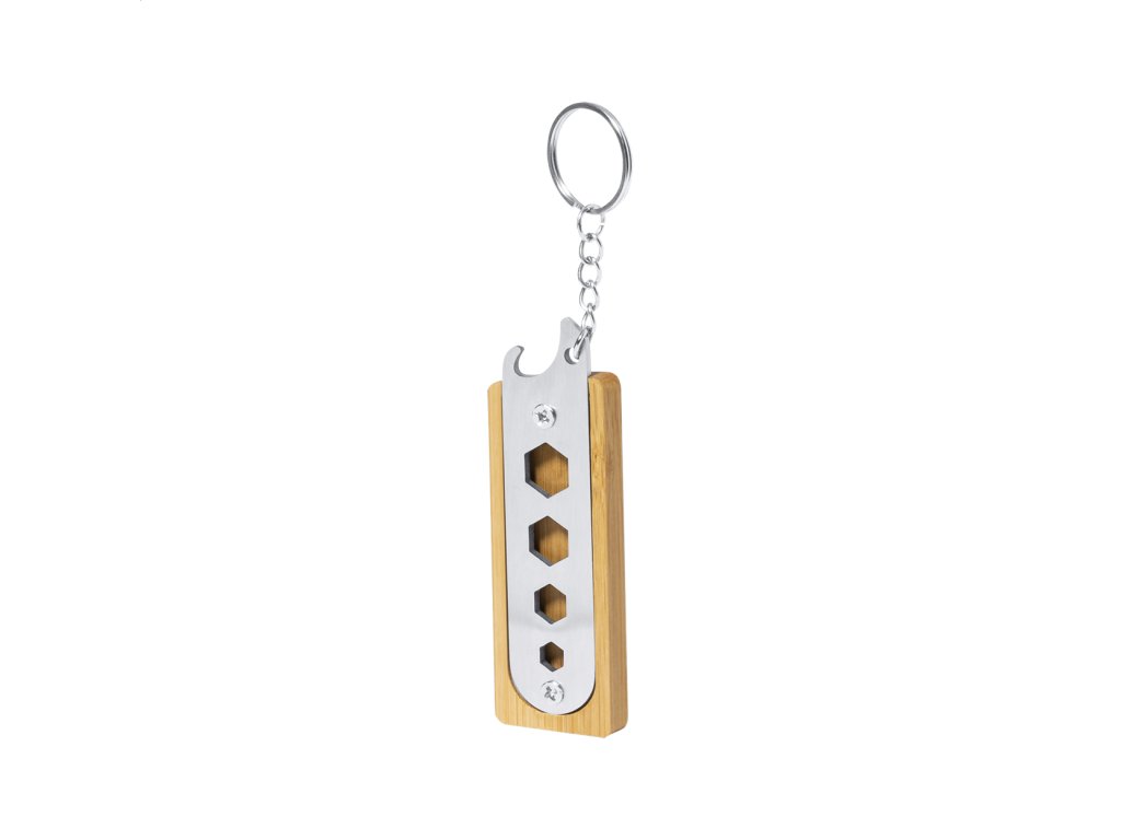 Prívesok na kľúče z bambusu a nerezovej ocele s otváračom na fľaše a 4 šesťhrannými otvormi pre kľúče.Dodatočné parametre