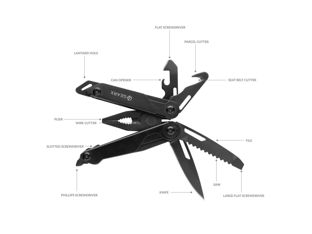 Luxusný multifunkčný nástroj pre široké využitie vo vnútri aj vonku. Všestrannosť, pevnosť a odolnosť ho charakterizujú najlepšie. Telo vyrobené z luxusného hliníka, nástroje a čepeľ z prémiovej 420 nehrdzavejúcej ocele. Všetko v čiernom odtieni. Disponuje celkom 13 funkciami: nôž (so zámkom), pílka, pilník, veľký plochý skrutkovač (so zámkom), štandardný plochý skrutkovač, krížový skrutkovač, kliešte, štandardné kliešte, štiepačky, otvárač fliaš, skrutkovač, nôž na pás, nôž na balíky. Balené v luxusnej darčekovej krabičke.Dodatočné parametre