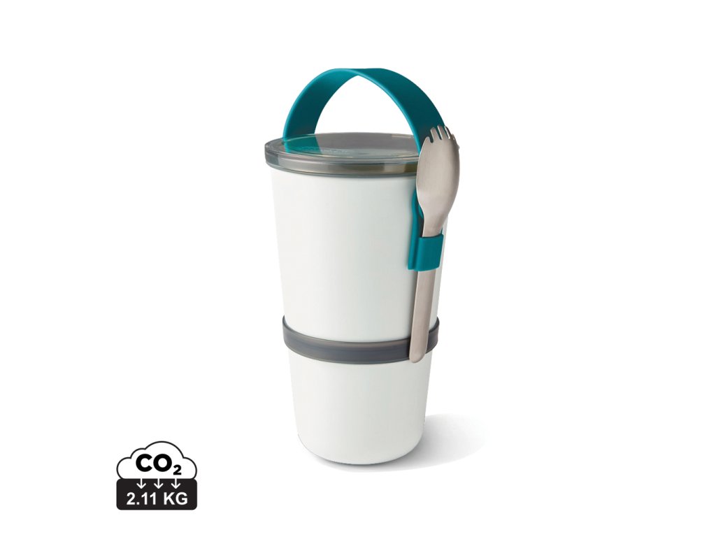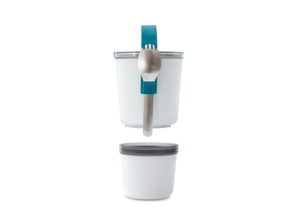 Nádoba na jedlo inšpirovaná indickými nosičmi tiffínov. Je štíhlejšia a vyššia, vďaka čomu je kompaktná a ľahko sa vloží do tašky. Skladá sa z dvoch nepriepustných častí, ktoré je možné do seba uzamknúť a prenášať ich ako celok. Praktické silikónové pútko pre ľahké prenášanie zároveň fixuje vidličku a lyžičku (2v1). Ideálne na oddelenie jogurtu a ovocia, rezancov a polievky, omáčky a prílohy. Po vyprázdnení je možné menšiu nádobu vložiť do väčšej pre ľahké uschovanie. Okrem veka je všetko vhodné do umývačky riadu a mikrovlnnej rúry.Dodatočné parametre