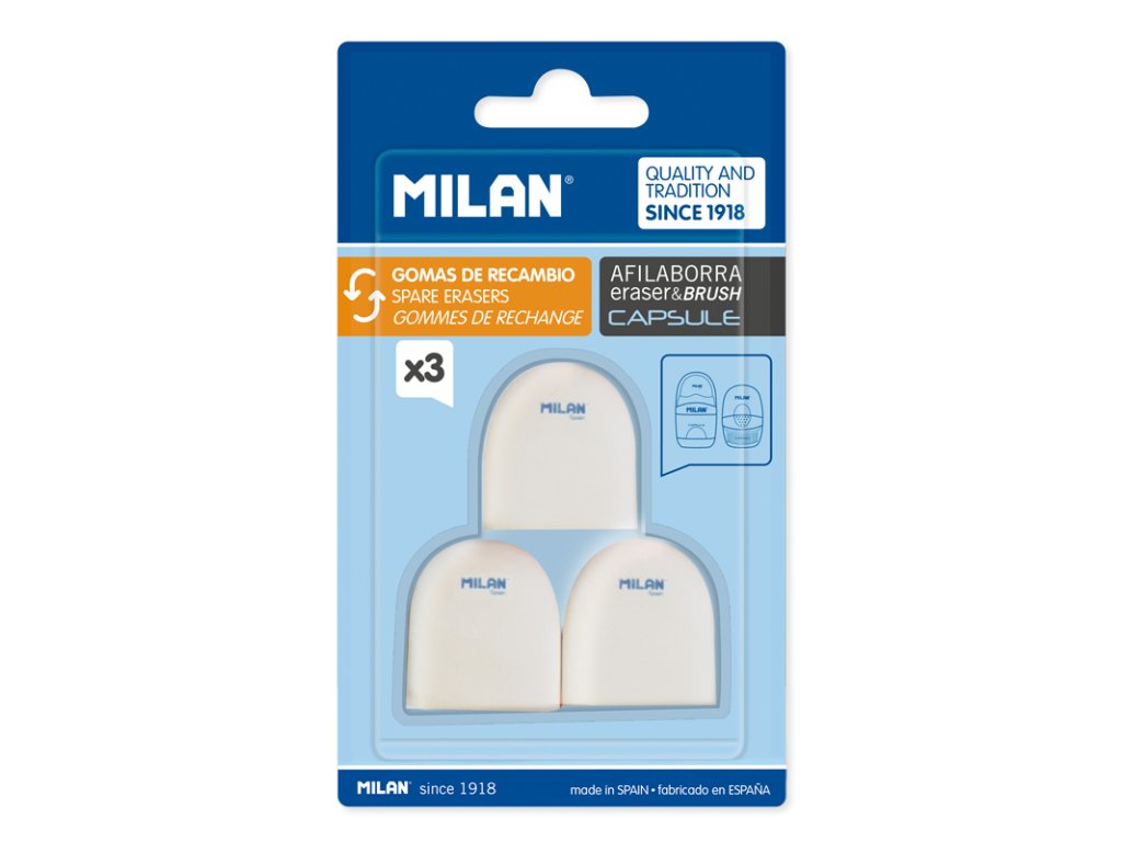 Sada náhradných gúm MILAN pre všetky strúhadlá s gumou CAPSULE. Sada obsahuje 3 ks náhradných gúm.