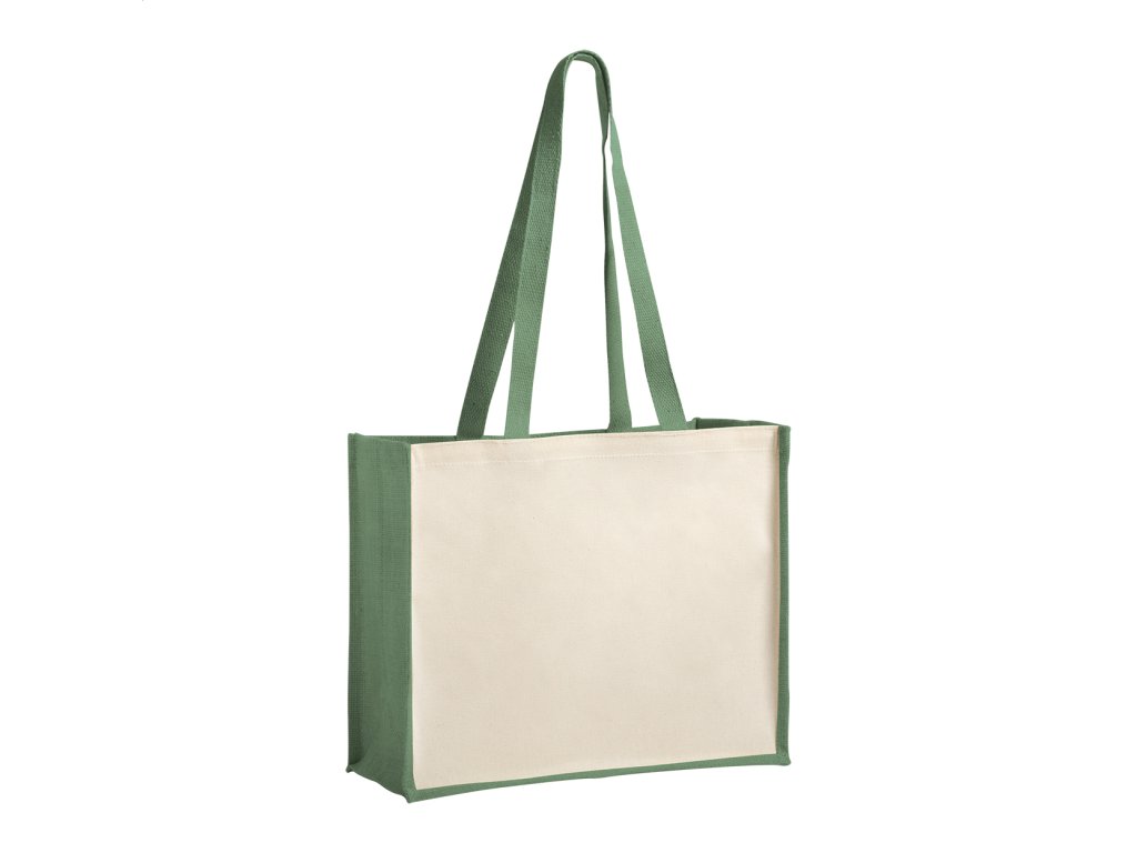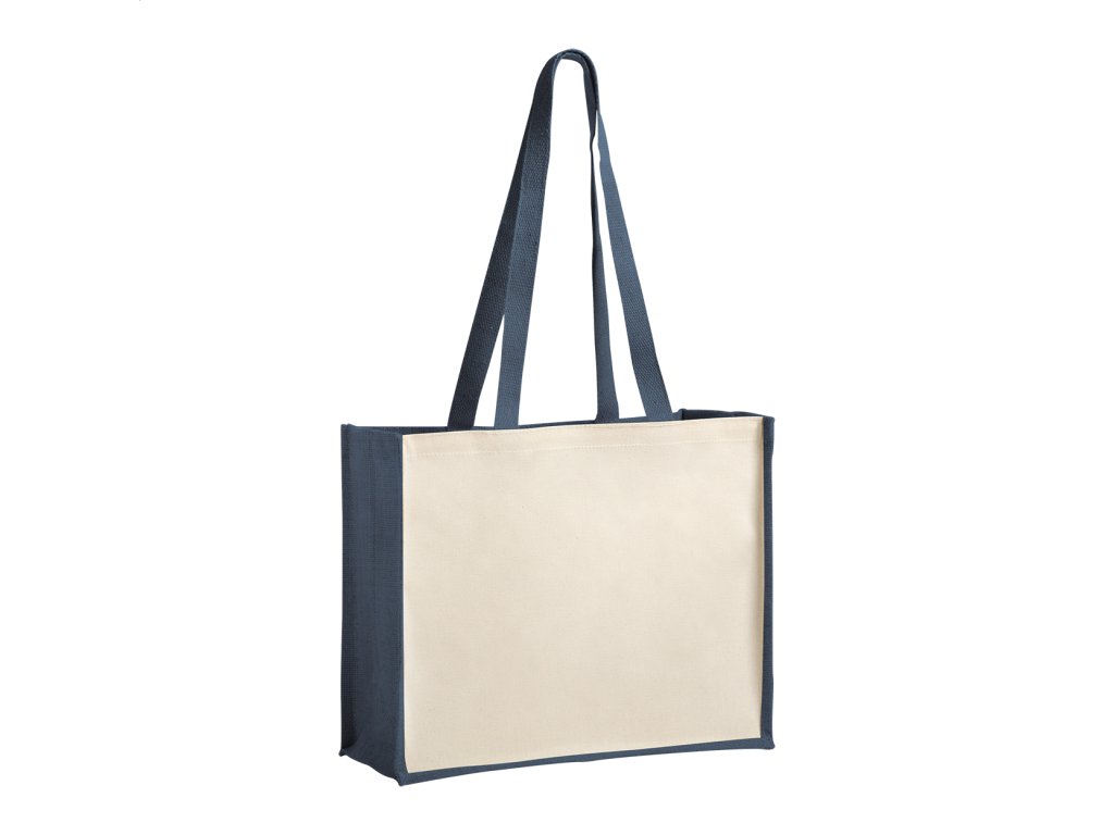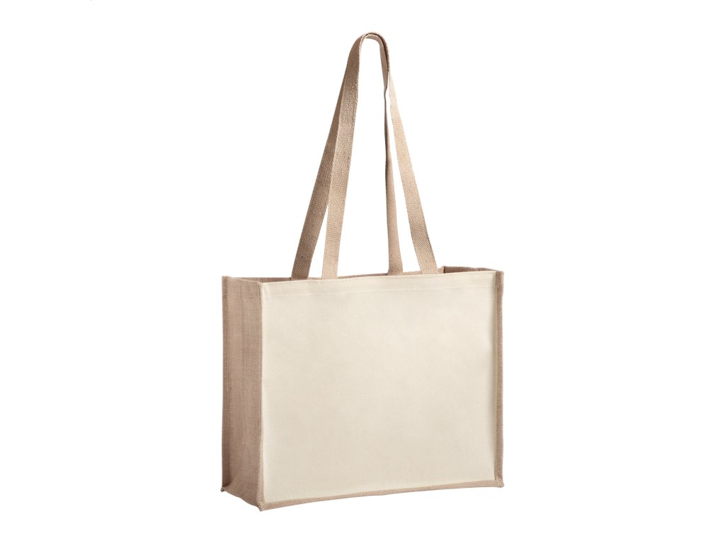 Nákupná taška v kombinácii laminovanej juty a laminovanej bavlny s dlhými rúčkami.Dodatočné parametre