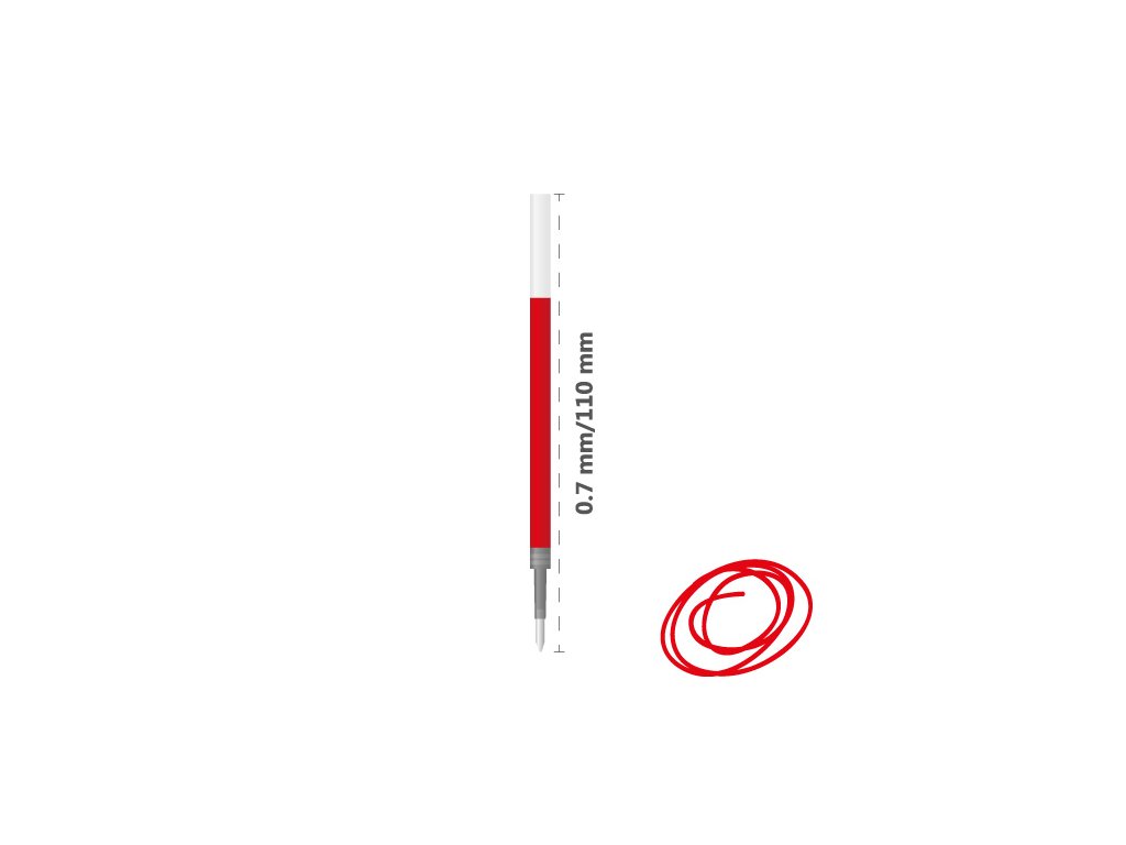 Gélová náplň do pera, červená farba, dĺžka 110 mm, priemer guľôčky 0,7 mm.