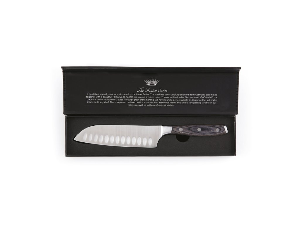 Nôž Santoku z nemeckej ocele X50CrMoV15 s rukoväťou z dreva pakka. Vďaka ľahko uchopiteľnej rukoväti a vynikajúcemu vyváženiu čepele je práca s nožom pohodlná a jednoduchá. Veľkosť: 14 cm čepeľ.Dodatočné parametre