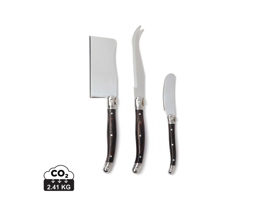 Exkluzívna sada nožov na syr z nehrdzavejúcej ocele pozostávajúca z dvoch nožov na syr a noža na maslo s rukoväťou z čierneho dreva pakka. Balené v exkluzívnej darčekovej škatuľke.Dodatočné parametre