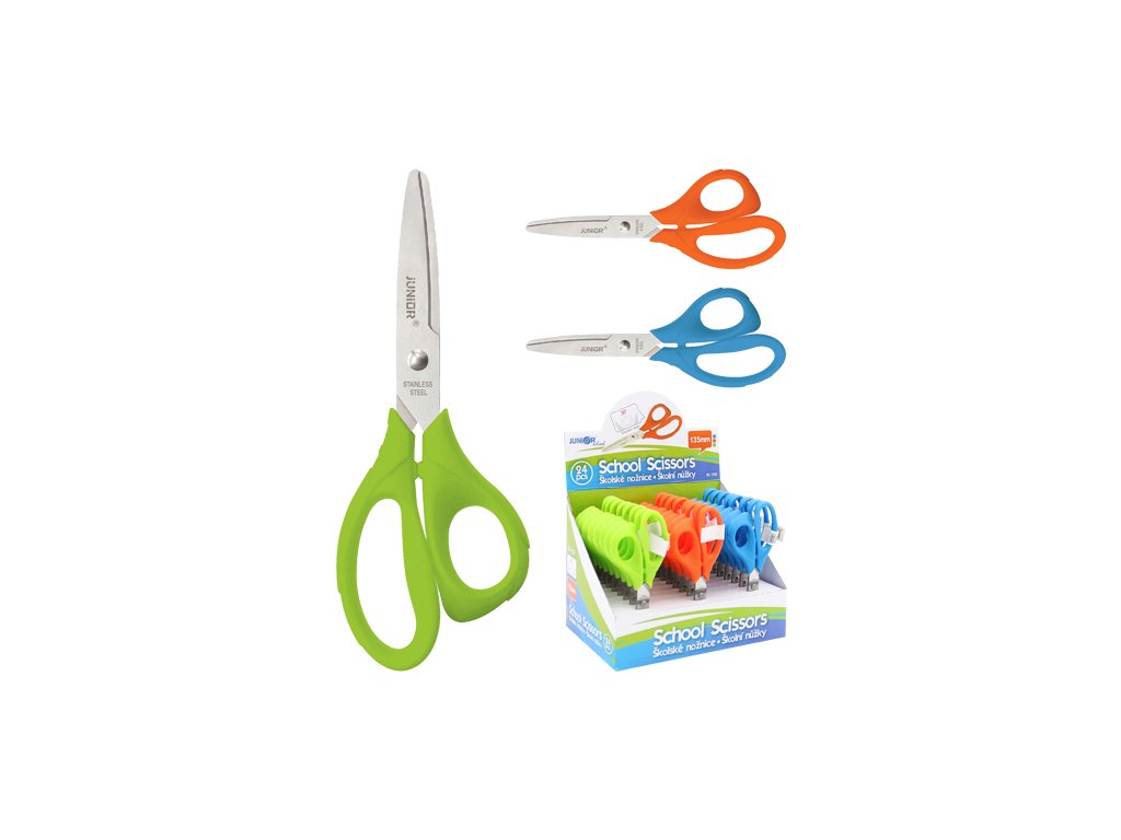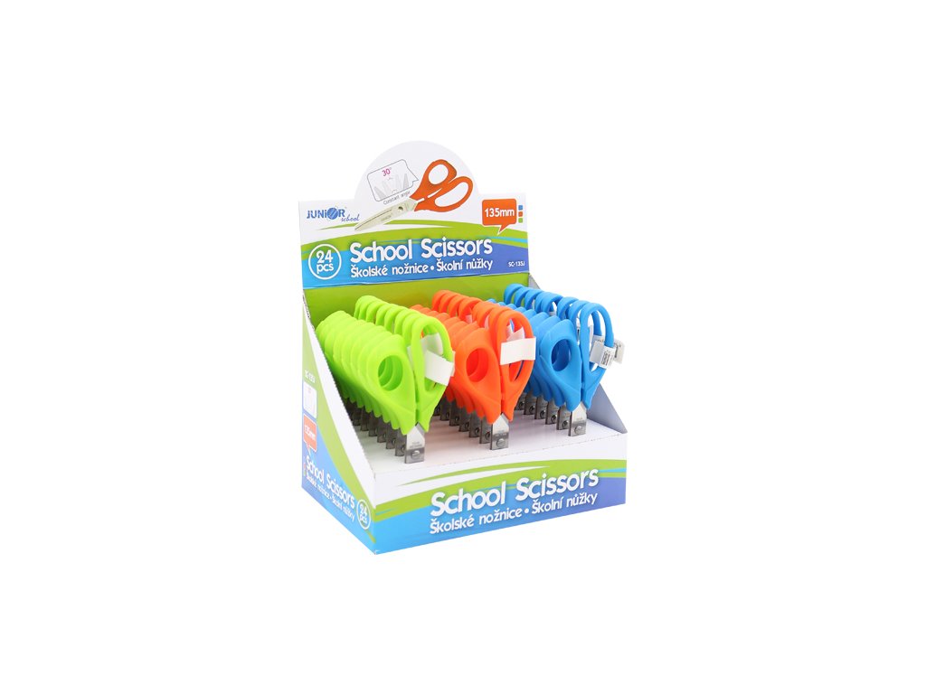 Školké nožnice s ergonomickou rukoväťou v troch pestrých farbách. Rukoväť je vyrobená z tvrdého ale zároveň na dotyk príjemného materiálu.Čepeľ nožníc je vyrobená z kvalitnej nerezovej ocele, pričom koniec čepele je zaoblený.Dodatočné parametre