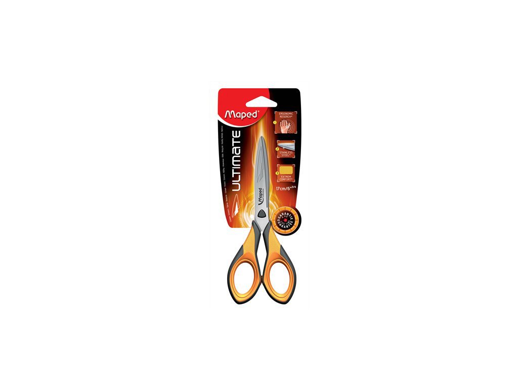 Ergonomické nožnice veľkosti 17 cm. Patentovaná technológia prispôsobenia rukovätí. Nit v tvare trojhranu, brúsená nerez oceľ s reliéfnym zdobením. Symetrické rukoväte. Francúzka značka MAPED zaručuje vysokú kvalitu, funkčnosť a moderný dizajn.Dodatočné parametre