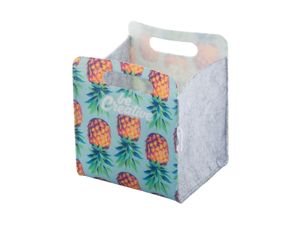 Na zákazku vyrobený plstený RPET stolný organizér s plnofarebnou potlačou. S vysekávanými rukoväťami a výrazným štítkom RPET. Cena je vrátane sublimačnej tlače, nezahŕňa tlačovú prípravu. Min. mn.: 50 ks.Dodatočné parametre