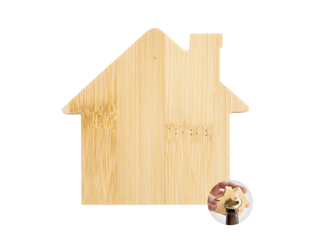 Bambusový magnet na chladničku v tvare domčeka s otváračom na fľaše.