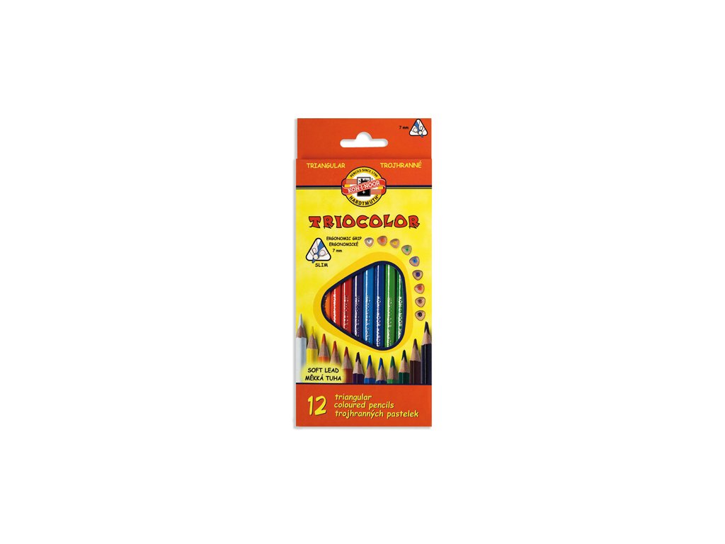 12-kusová sada trojhranných pasteliek s dobrou krycou schopnosťou a dreveným lakovaným telom, dodávaná v papierovom boxe s eurozávesom. Značené trojhranné pastelky TRIOCOLOR, dĺžka 175 mm, hrúbka pastelky 7,2 mm.Dodatočné parametre