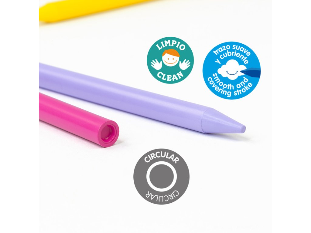 Pastelky MILAN sú pestrofarebné plastické ceruzky, pevné, ideálne pre malé deti. Guľatý dizajn so zaoblenými rohmi perfektne padne do rúk malých detí. Jemné čiary sa môžu nakresliť pomocou špičky ceruzky, hrubé čiary sa môžu nakresliť pomocou koncovej časti a väčšie plochy sa môžu lemovať po celej dĺžke ceruzky. Sada obsahuje 10 ks základných farieb + 2 ks fluo farieb.Dodatočné parametre
