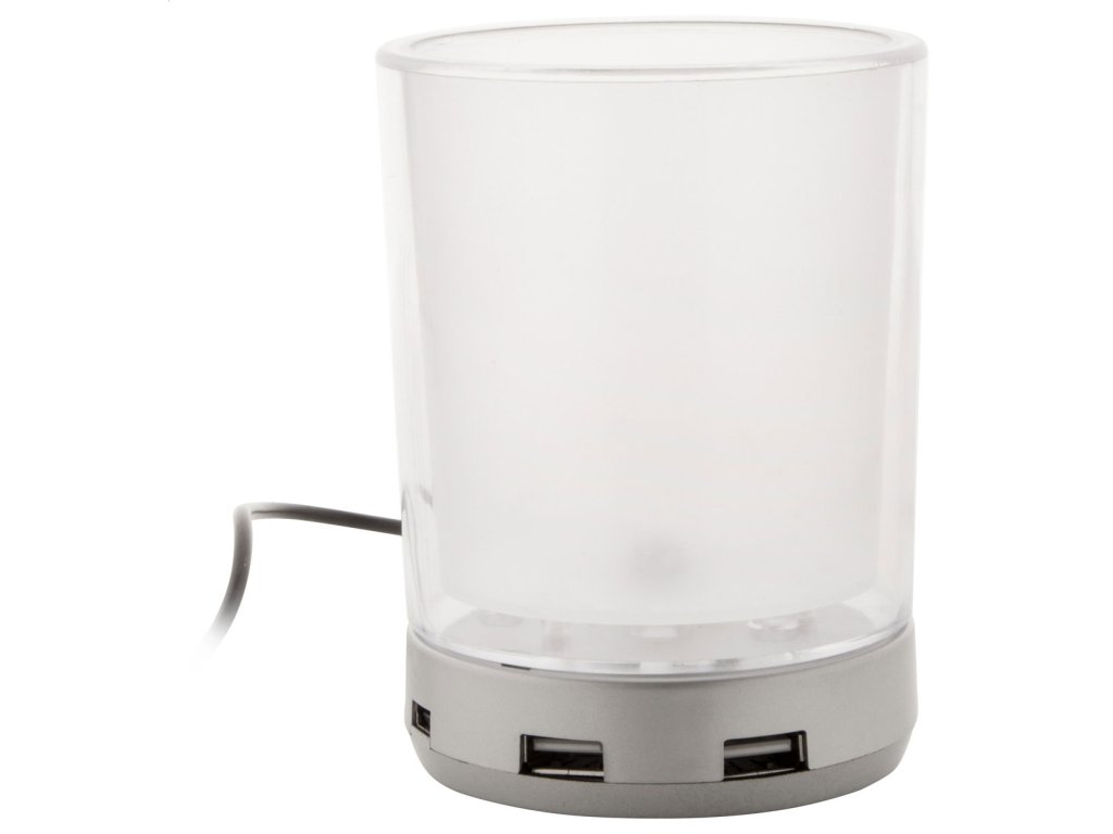Stolný držiak na pero so 4-portovým rozbočovačom USB a modrým svetlom, USB 2.0., materiál: MATERIÁL: ABS. Medzi 2 steny možno umiestniť vlastnú grafiku s potlačou.Dodatočné parametre