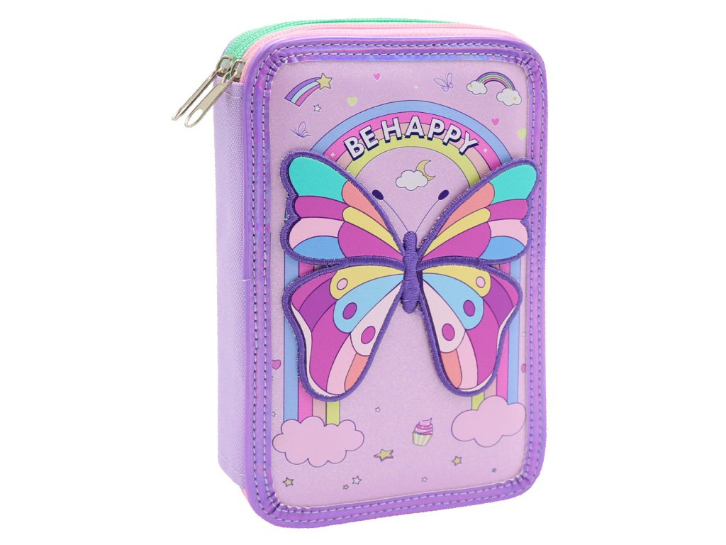 Fialové lemovanie hrajúc dúhovými farbami + gumová nášivka Motýľa.