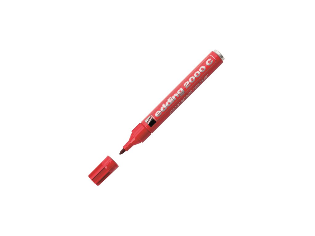 Permanentný popisovač Edding 2000C červený s okrúhlym hrotom strednej hrúbky na značenie kovu, skla, umelých hmôt a takmer všetkých materiálov. Opätovne naplniteľný atramentom edding T 25, alebo MTK 25. Hliníkový obal vo farbe popisovača. Vymeniteľné písacie hroty. Svetlostály. Šírka stopy: 1-3 mm.Dodatočné parametre