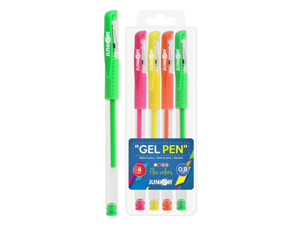 Sada gélových pier FLUO s transparentným plastovým telom a jednofarebným gumovým úchopom a vrchnákom vo farbe náplne, 4 ks v balení.Dodatočné parametre