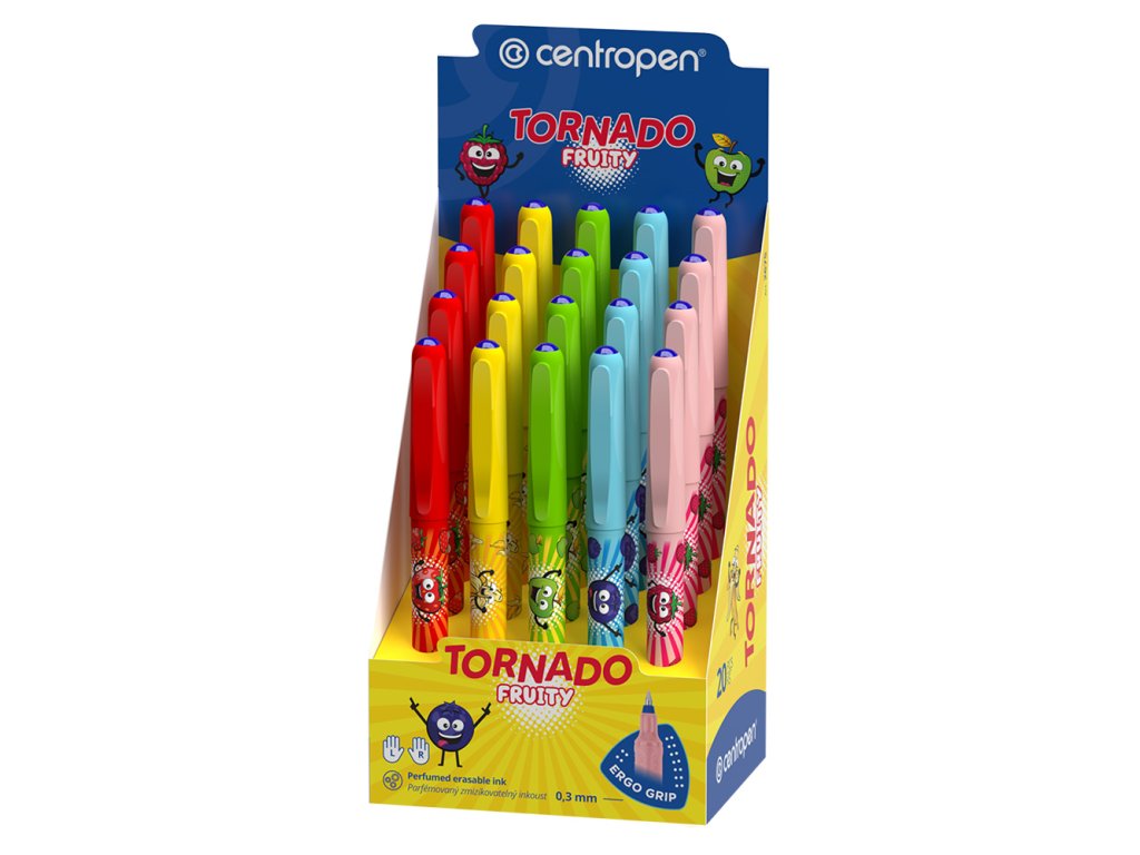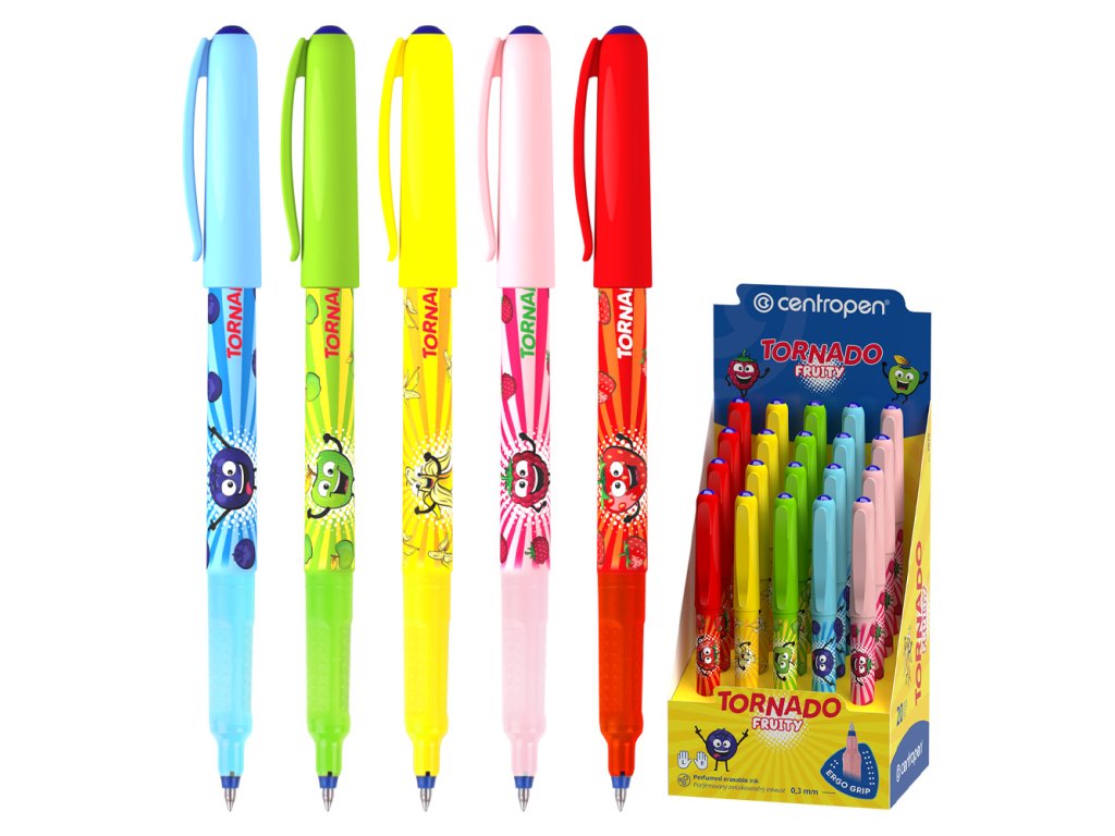 Obľúbené guľôčkové pero Tornado s trojuholníkovou úchopovou časťou s masážnymi bodmi, s tenkou rovnomernou stopou šírky 0.3 mm, ktorá sa dá vyzmizíkovať, atramentová náplň modrej farby - parfumovaný atrament (banán, jablko, jahoda, malina, čučoriedka). Telo pera je z kvalitného plastu, dodávané v 5 farebných kombináciách. Pero je určene pre pravákov, ľavákov i dysgrafikov.Dodatočné parametre