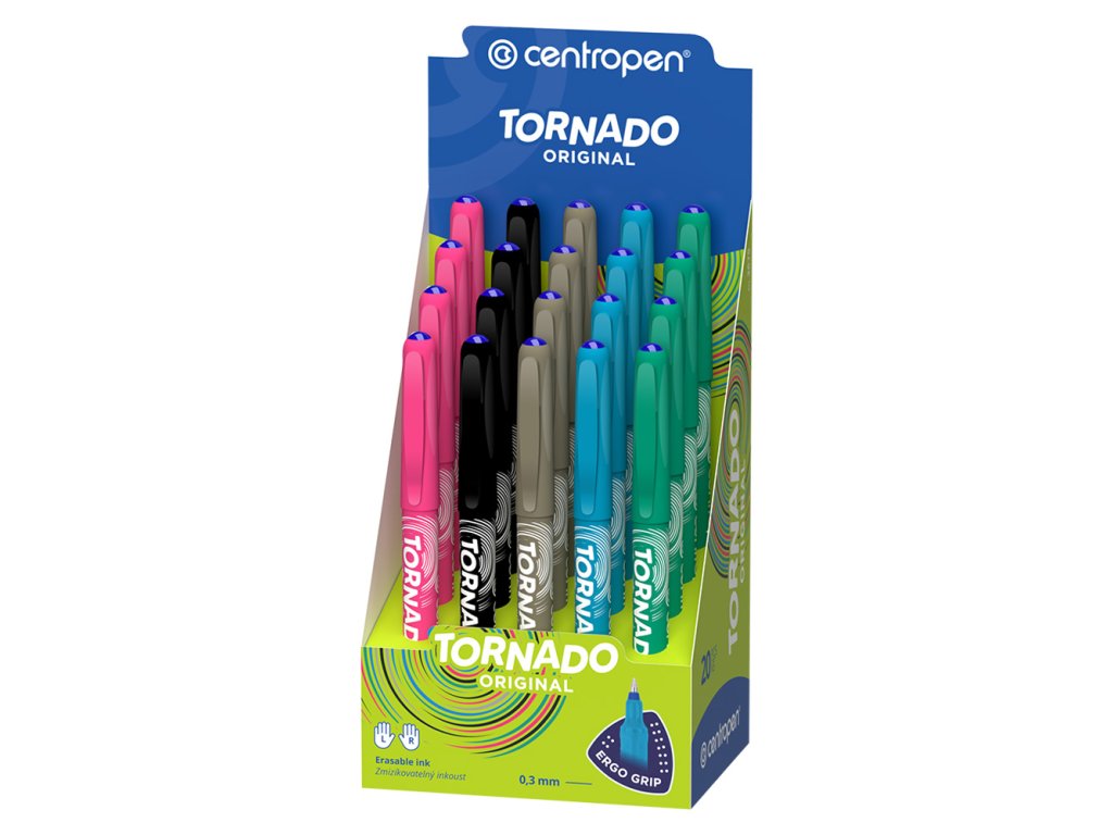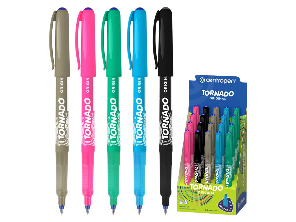Obľúbené guľôčkové pero Tornado s trojuholníkovou úchopovou časťou, s masážnymi bodmi, s tenkou rovnomernou stopou šírky 0.3 mm, ktorá sa dá vyzmizíkovať, atramentová náplň modrej farby. Telo pera je z kvalitného plastu, dodávané v 5 farebných kombináciách. Pero je určené pre pravákov i ľavákov.Dodatočné parametre