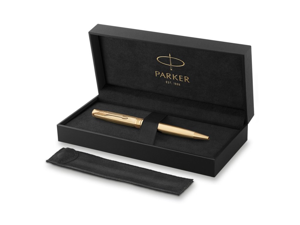 Guľôčkové pero Parker Sonnet SE Ciselé GT má telo vyrobené z mosadze a zdobené jemným, lešteným vzorom Ciselé v zlatej farbe. Úchopová časť a klip sú z vysoko leštenej mosadze so zlatou povrchovou úpravou.