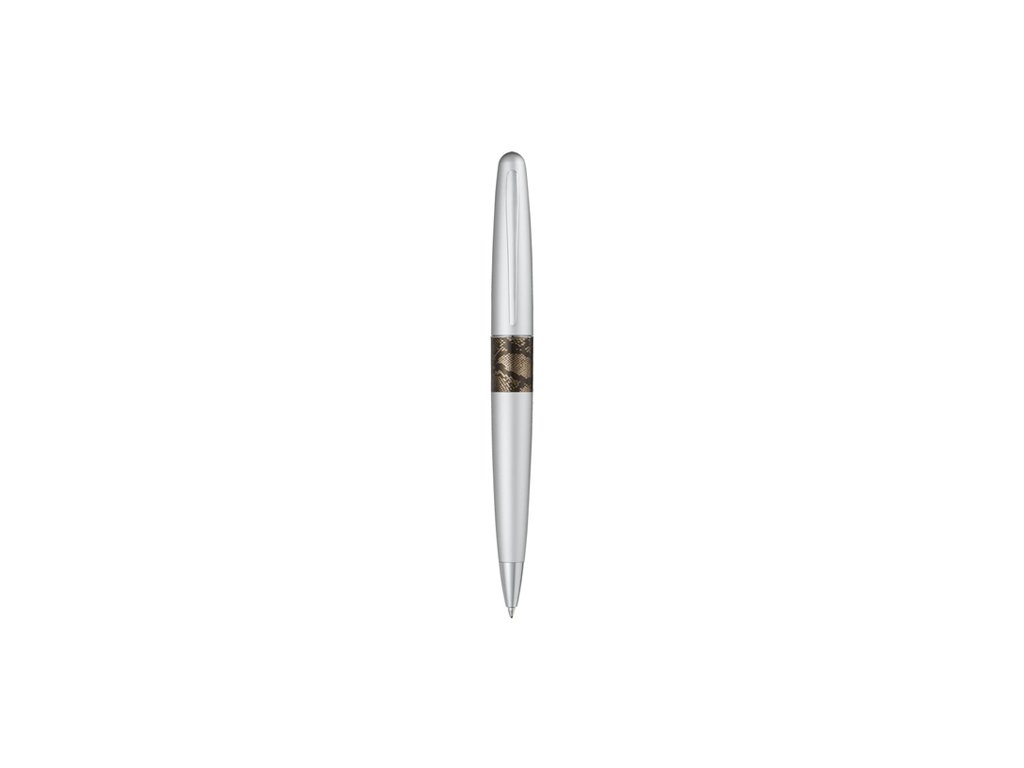 Guľôčkové pero s vymeniteľnou náplňou modrej farby, od obľúbenej značky PILOT. Telo pera je vyhotovené v striebornej matnej farbe, stredová časť pera zdobená efektom kože pythona, rovnako ako plechová krabička na uloženie pera, ktorá je súčasťou balenia. Strieborná farba dodáva výrobku exkluzívny vzhľad. Moderný atraktívny dizajn.Dodatočné parametre