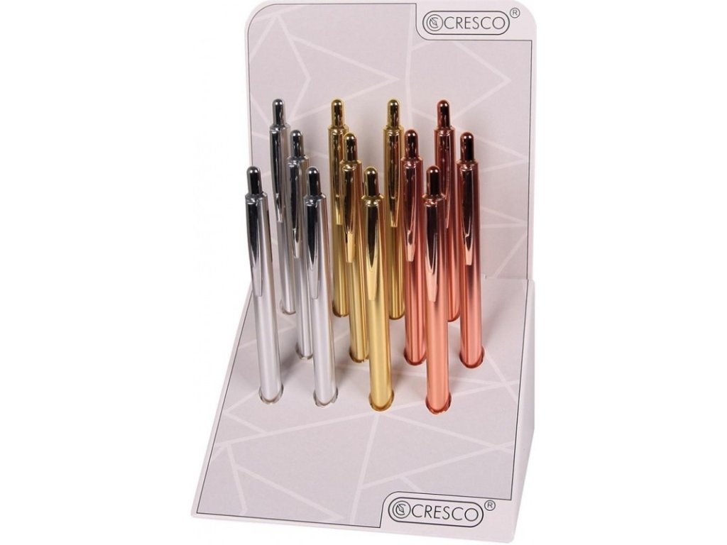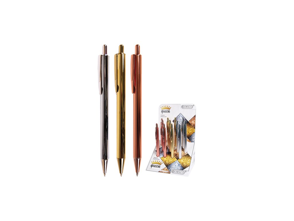 Guľôčkové pero s lesklým telom vo farbách drahých kovov pritiahne pozornosť na Vašom stole.