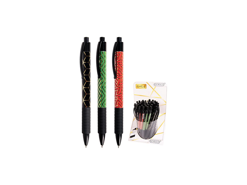 Guľôčkové pero s plastovým telom a potlačou v čiernej, zelenej a červenej farbe v kombinácii so zlatými prvkami.