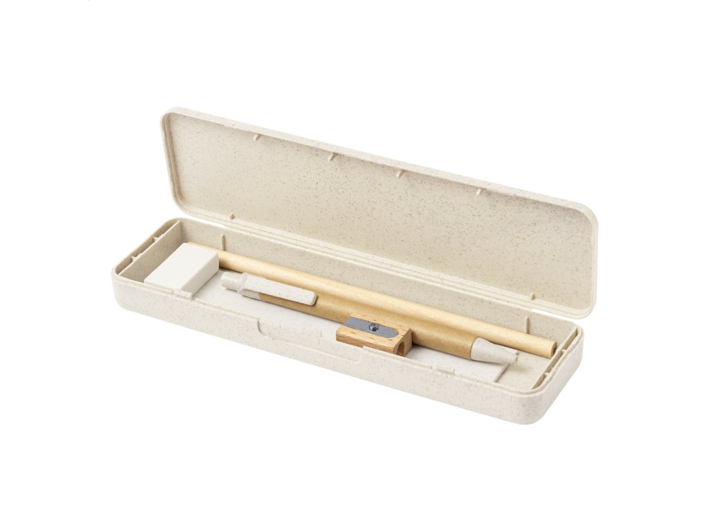 5ks písacia sada v ekologickom púzdre z pšeničnej slamy. Vrátane drevené ceruzky, recyklovaného papiera a plastového guľôčkového pera z pšeničnej slamy s modrou náplňou, 15 cm pravítka, dreveného strúhadla a gumy.Dodatočné parametre