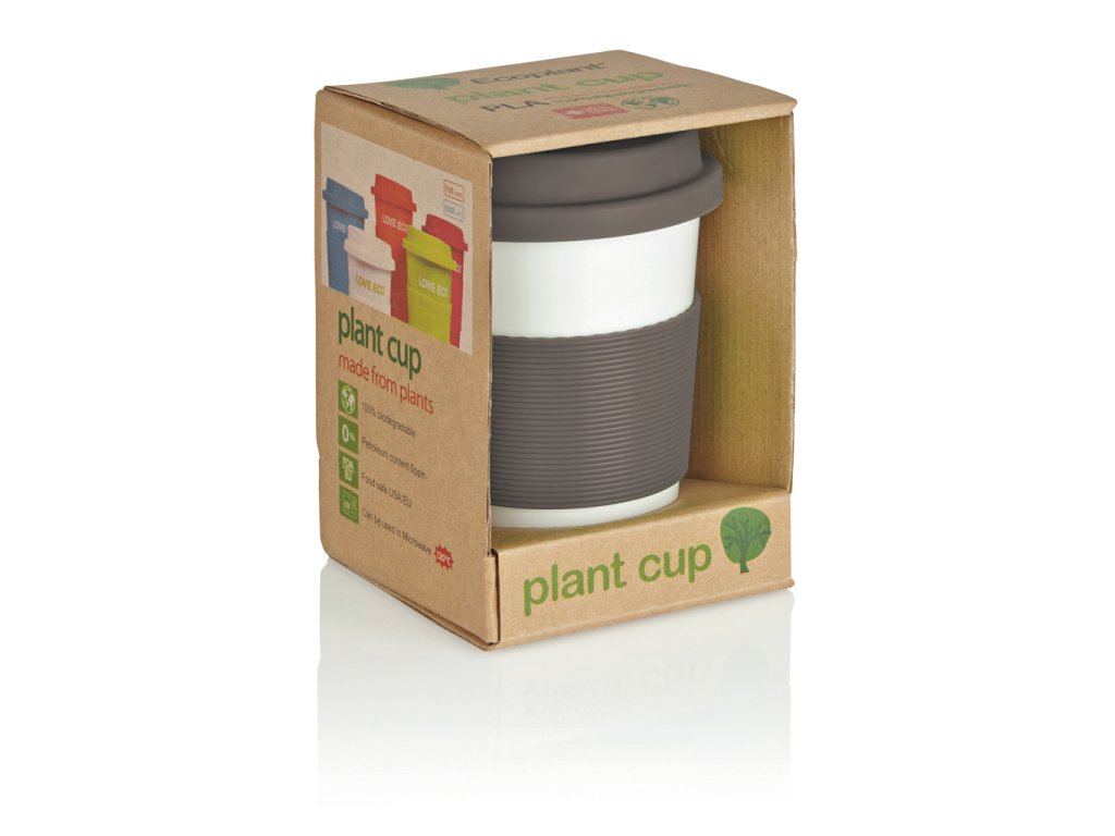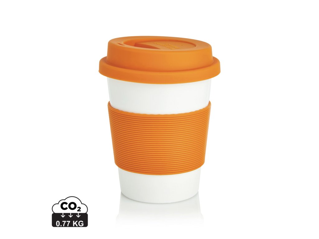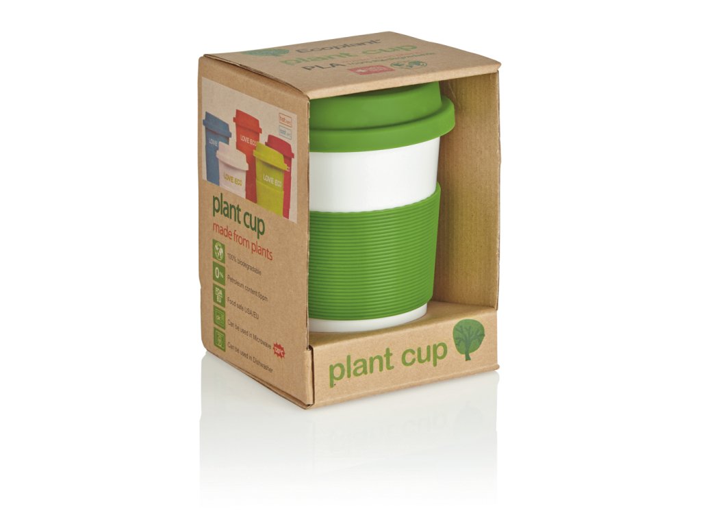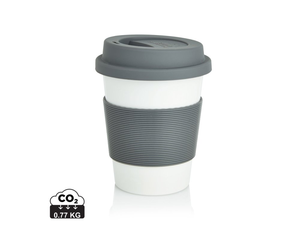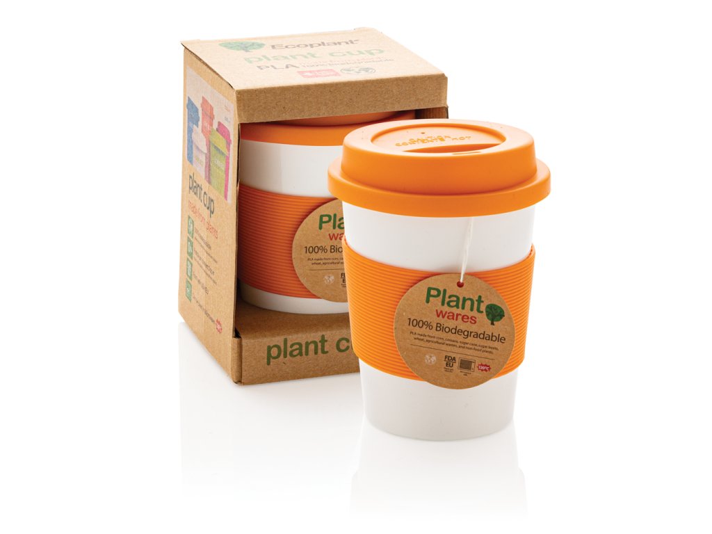 Hrnček so silikónovým úchytom a viečkom. Vyrobený zo 100 % rastlinného materiálu (PLA). Vhodný do umývačky riadu. BPA free. Objem: 350 ml.Dodatočné parametre