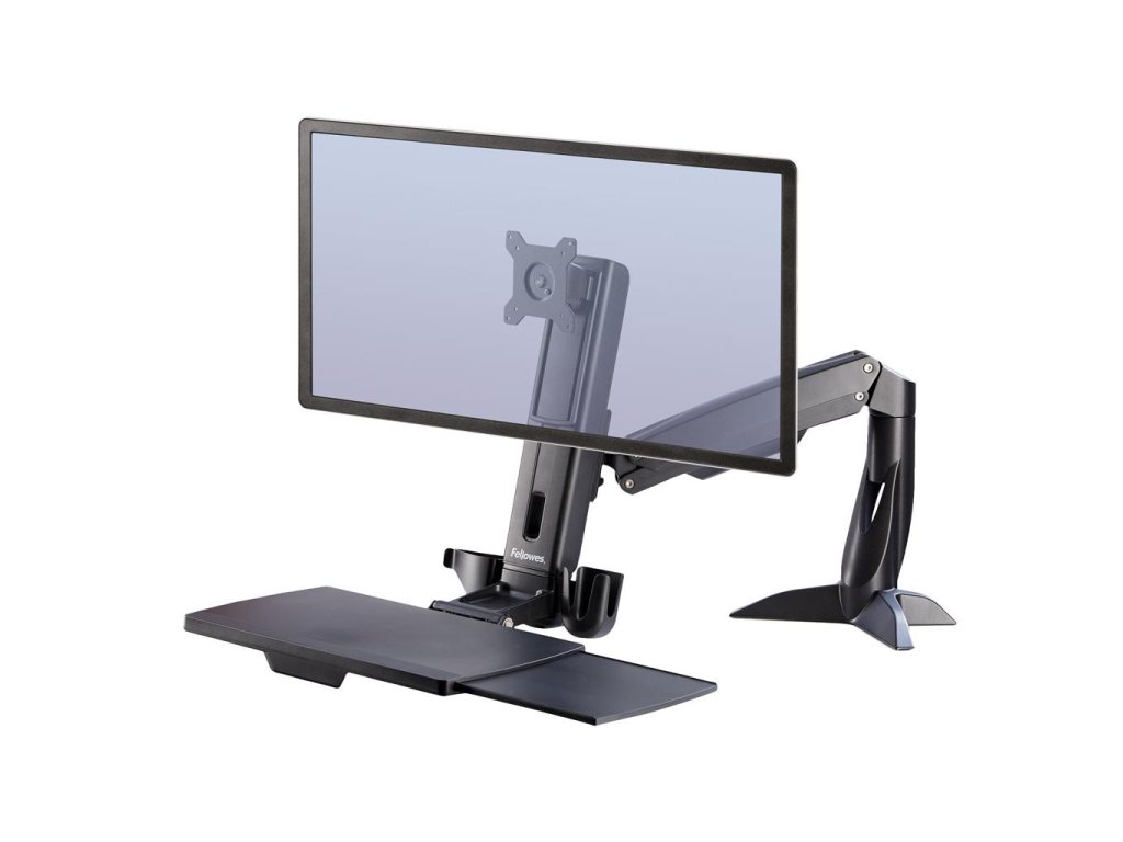 Menší stojan Sit-Stand so sklopným držiakom na klávesnicu a držiakmi príslušenstva. Kompatibilný s VESA, vhodný na 1 monitor do 8 kg a 24`, podložka na klávesnicu do 2,5 kg. Manuálne nastavenie výšky 56 cm pomocou plynového pružinového mechanizmu, čo umožňuje aj zdieľanie obrazovky alebo spoluprácu. K stolu sa upevňuje pomocou svorky, súčasťou je vedenie káblov.Dodatočné parametre