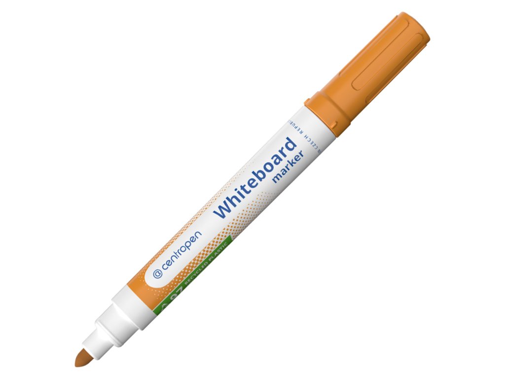 Stierateľný značkovač na biele smaltované tabule, PVC, sklo, porcelán. Atranent je za sucha stierateľný, svetlostály, Náplň je zdravotne neškodlivá, valcový hrot s priemerom 5 mm, šírka stopy 2,5 mm. Skladujte vo vodorovnej polohe. Farba oranžová.Dodatočné parametre