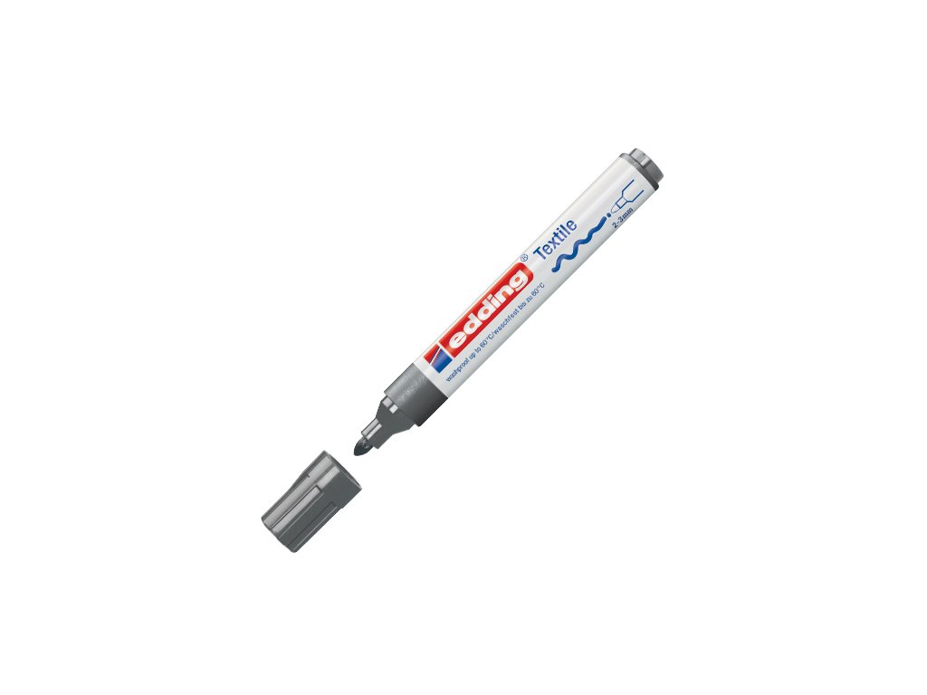 Popisovač na textílie s okrúhlym hrotom strednej hrúbky. Plnený atramentom bez zápachu na báze vody. Farby treba zafixovať žehlením na sucho. Po zafixovaní sú farby odolné voči praniu do 60°C. Šírka stopy: 2-3 mm. Farba: sivá.Dodatočné parametre