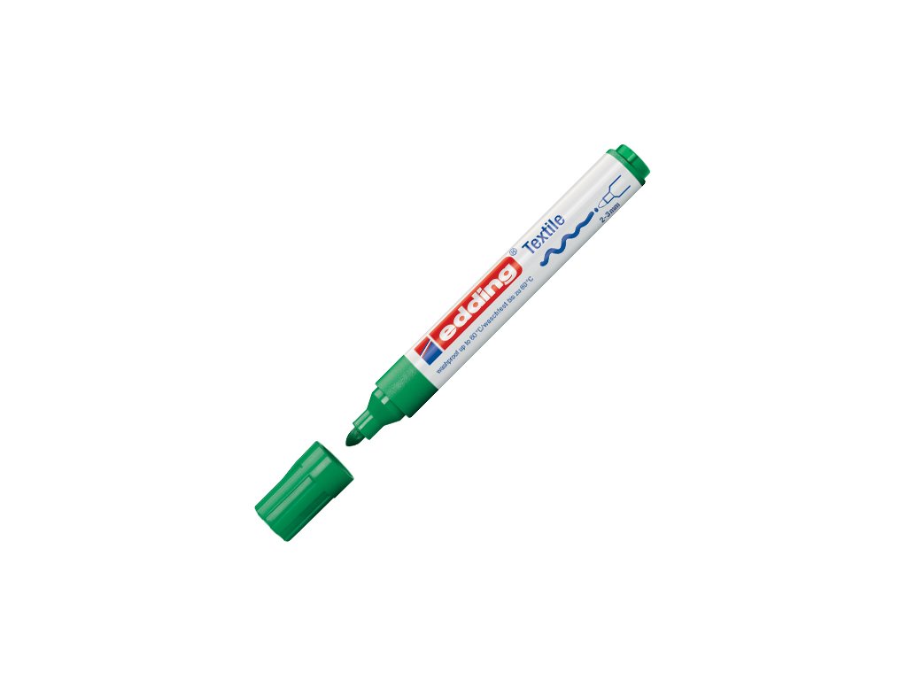 Popisovač na textílie s okrúhlym hrotom strednej hrúbky. Plnený atramentom bez zápachu na báze vody. Farby treba zafixovať žehlením na sucho. Po zafixovaní sú farby odolné voči praniu do 60°C. Šírka stopy: 2-3 mm. Farba: zelená.Dodatočné parametre