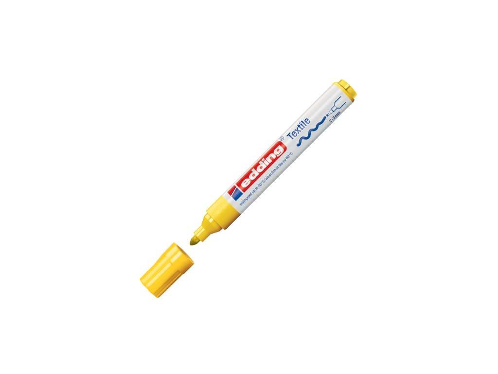 Popisovač na textílie s okrúhlym hrotom strednej hrúbky. Plnený atramentom bez zápachu na báze vody. Farby treba zafixovať žehlením na sucho. Po zafixovaní sú farby odolné voči praniu do 60°C. Šírka stopy: 2-3 mm. Farba: žltá.Dodatočné parametre