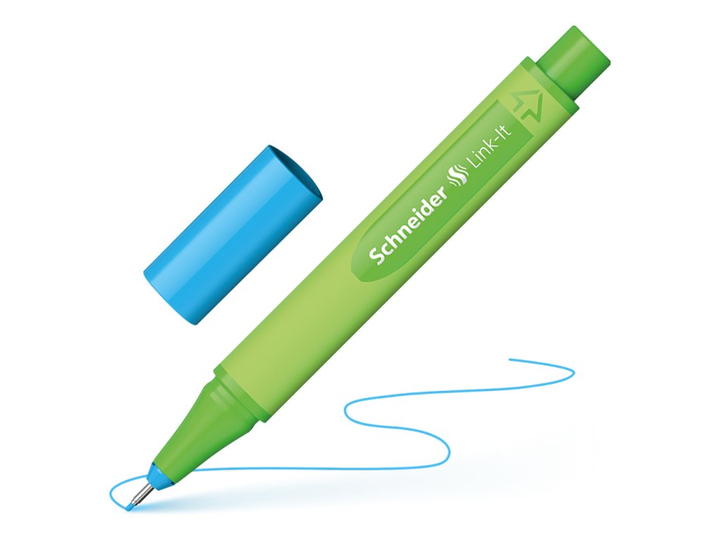 Popisovač Schneider Link-It 0,4 mm svetlomodrá . Klikk! Inovativní, spojitelné linery a fixy, které po spojení tvoří pero s 2 hroty po spojení vzniká 1 popisovač, který zajistí úsporu místa na stole, nebo v penálu Link-it linery a fixy lze libovolně spojovat v 16 různých barvách pogumovaný, trojúhelníkový tvar těla pro pohodlné psaní tělo v 88% z plastu s BIO základem barva víka se shoduje s barvou inkoustu inkoust na bázi vody hrot fixy tloušťka písma: 0,4mmDodatočné parametre