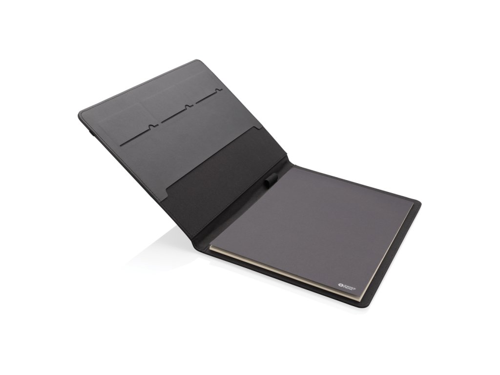 Portfólio značky Swiss Peak vo formáte A4 vyrobené z 300D recyklovaného polyesteru. Je vybavené pútkami na perá, sloty na vizitky, priestranným vreckom formátu A4. Obsahuje vymeniteľný poznámkový blok A4 s 20 stranami linkovaného krémového FSC® papiera (70g/m2). Vyrobené zo 100% recyklovaného polyesteru vrátane skenovateľnej zložky AWARE™ garantujúce obsah recyklátu. Balené v FSC® darčekovej krabičke.Dodatočné parametre