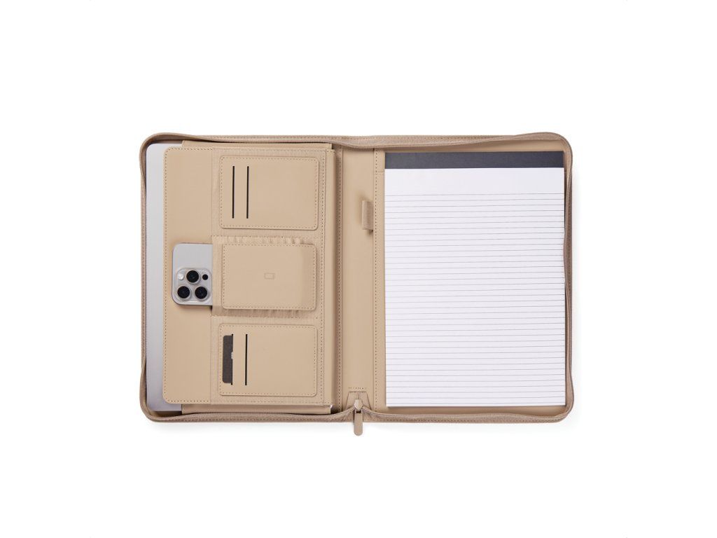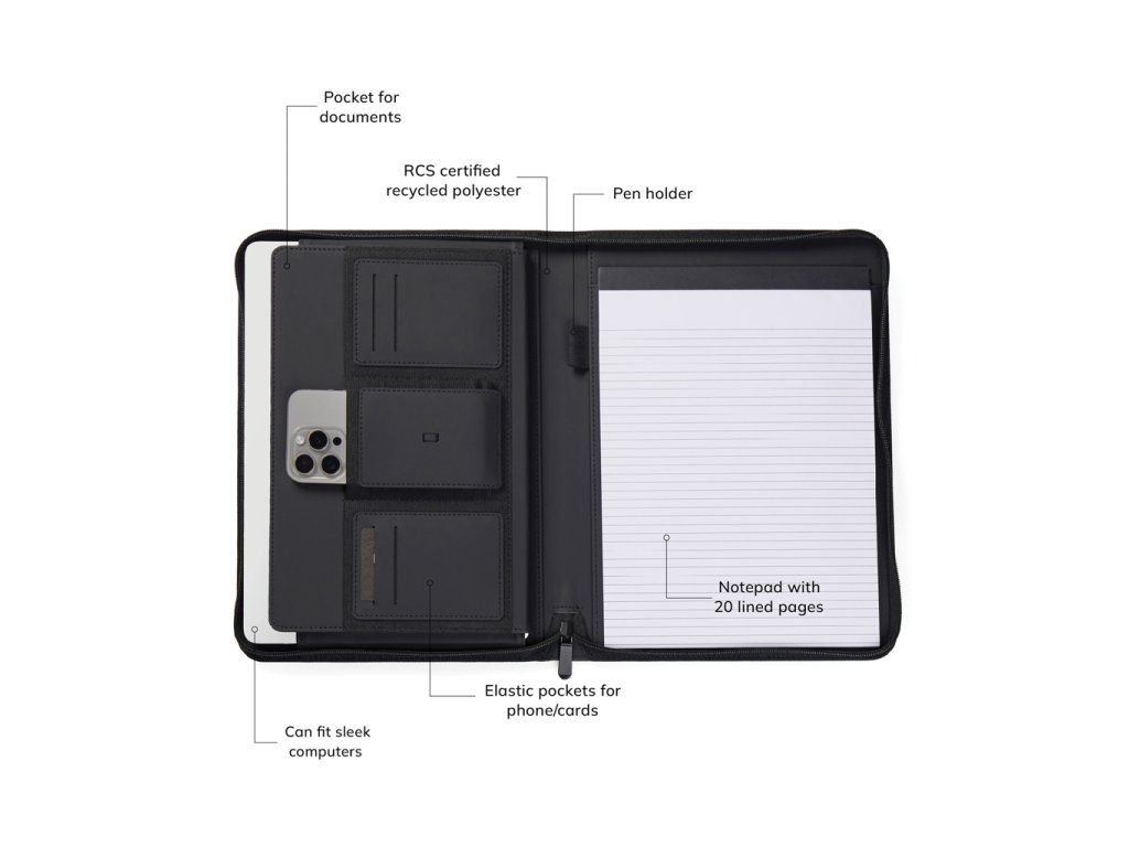Elegantné portfólio veľkosti A4 je vybavené držiakom na pero, vreckom na papier, vreckami na karty, telefón a poznámkovým blokom s 20 linkovanými stránkami. Toto portfólio je vyrobené z čiastočne recyklovaného polyesteru s klasickým matným PU povrchom Baltimore a je ideálnym doplnkom na váš pracovný stôl alebo na cesty. Papierová vložka je vymeniteľná. Certifikácia RCS zaručuje, že celý dodávateľský reťazec recyklovaných materiálov je certifikovaný. Celkový obsah recyklovaných materiálov sa odvíja od celkovej hmotnosti výrobku. Tento výrobok obsahuje 6% recyklovaného polyesteru s certifikáciou RCS.Dodatočné parametre