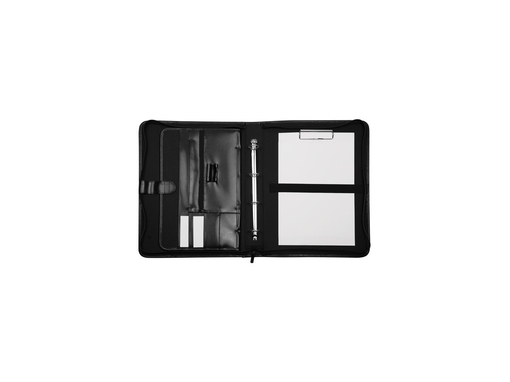 Portfólio so 4-krúžkovou mechanikou, vnútornými priečinkami na dokumenty, s uzatváraním na zips a s rukoväťou. Vyrobené z imitácie kože, v čiernom prevedení, formát A4. Rozmer: 390x300x50 mmDodatočné parametre