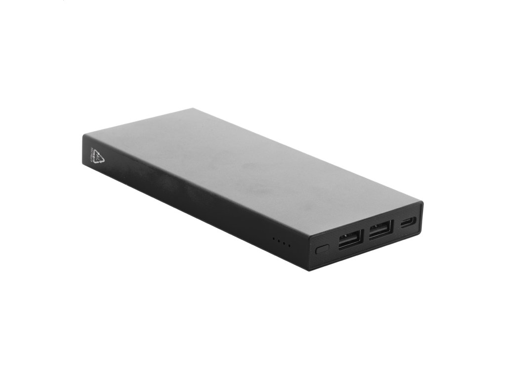 Power banka z recyklovaného hliníka s 10000 mAh batériou. S 2 portami USB a 1 portom USB-C pre nabíjačku. Vstupný port USB-C. Vrátane USB nabíjacieho kábla.Dodatočné parametre