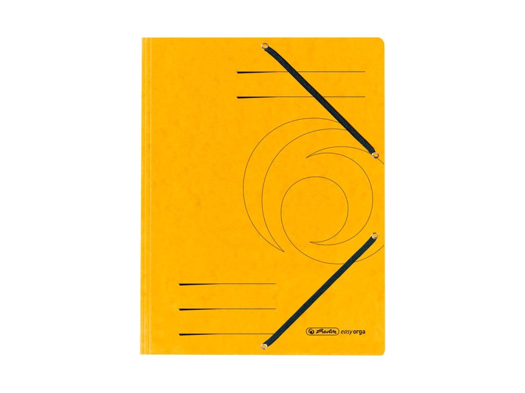 Obal A4 s tromi chlopňami a dvomi gumičkami čiernej farby. Materiál prešpánový kartón gramáže 355 g / m². Väčšie balenie 25 ks. Farba žltá.Dodatočné parametre