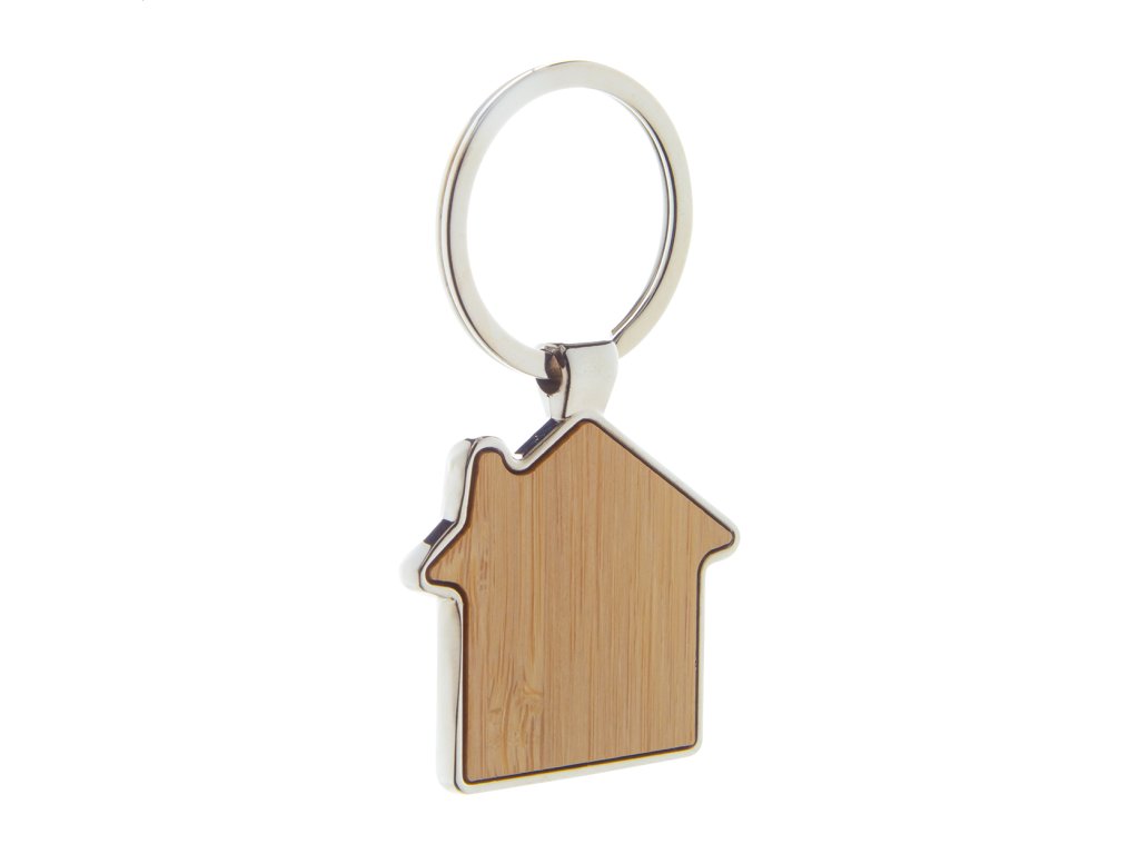 Kovový prívesok na kľúče v tvare domčeka s bambusovou vložkou. V kraft papierovej krabici.Dodatočné parametre
