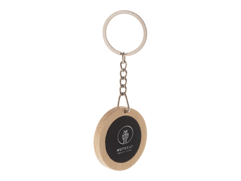 Bambusový prívesok na kľúče s pogumovanou nerezovou doštičkou a kovovým krúžkom. So špeciálnou vrstvou na zrkadlové laserové gravírovanie.Dodatočné parametre