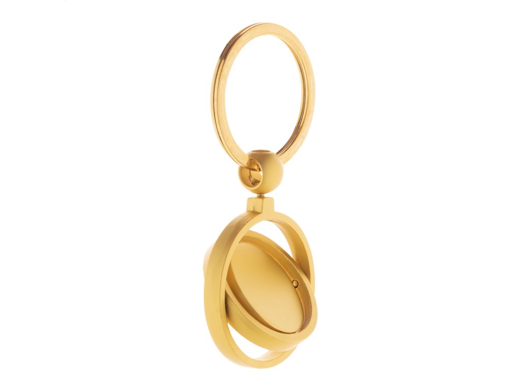 Kovový prívesok na kľúče v zlatom prevedení s otočnou vnútornou časťou. V kraftovej papierovej krabici.Dodatočné parametre