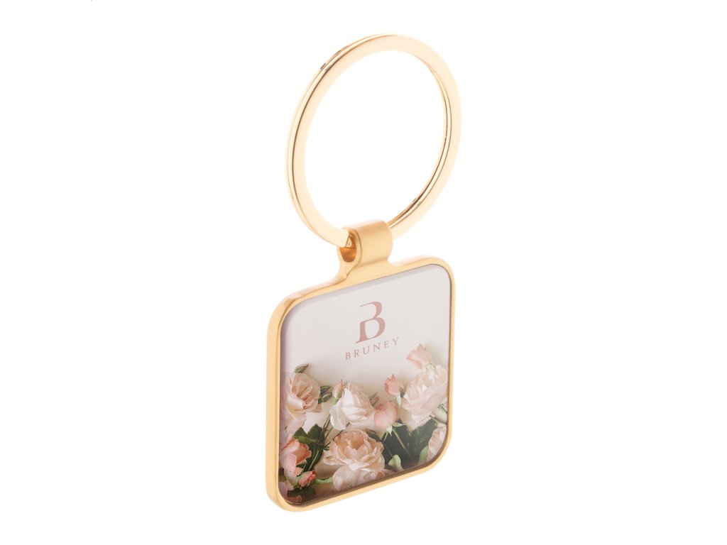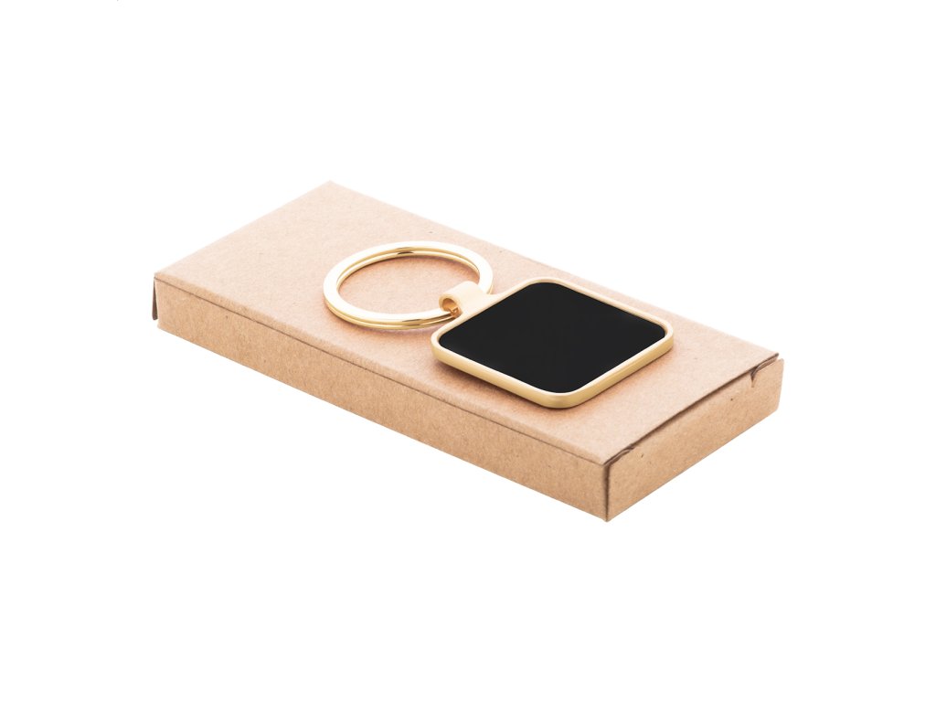 Kovový prívesok na kľúče štvorcového tvaru v zlatom prevedení s bronzovou doštičkou. V kraftovej papierovej krabici.Dodatočné parametre