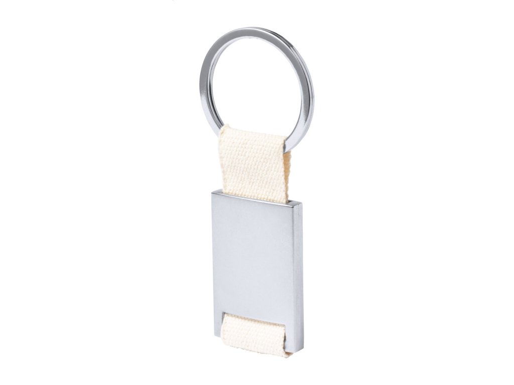 Obdĺžnikový kovový prívesok na kľúče s bavlneným pásikom a kovovým krúžkom.Dodatočné parametre