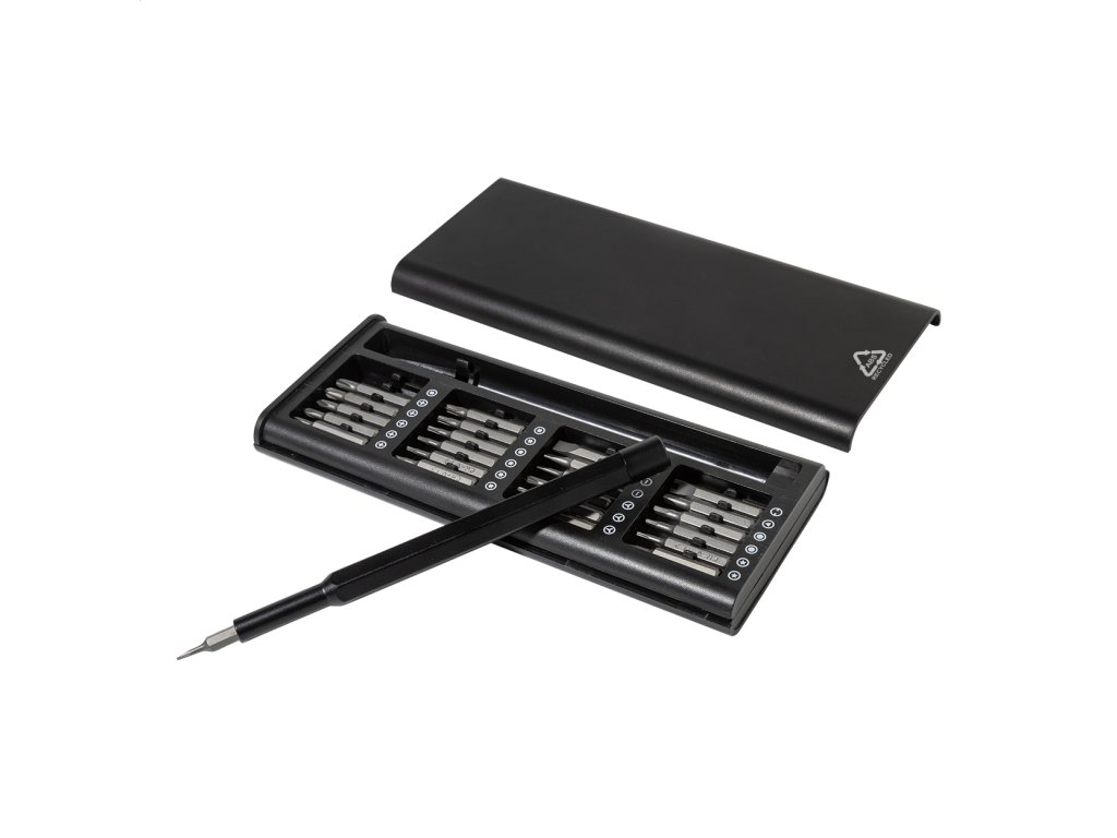 Súprava presných skrutkovačov s 24 bitmi v puzdre z recyklovaného ABS plastu. Rukoväť skrutkovača je vybavená magnetickým uchytením bitov pre rýchlu a bezpečnú výmenu bitov.Dodatočné parametre