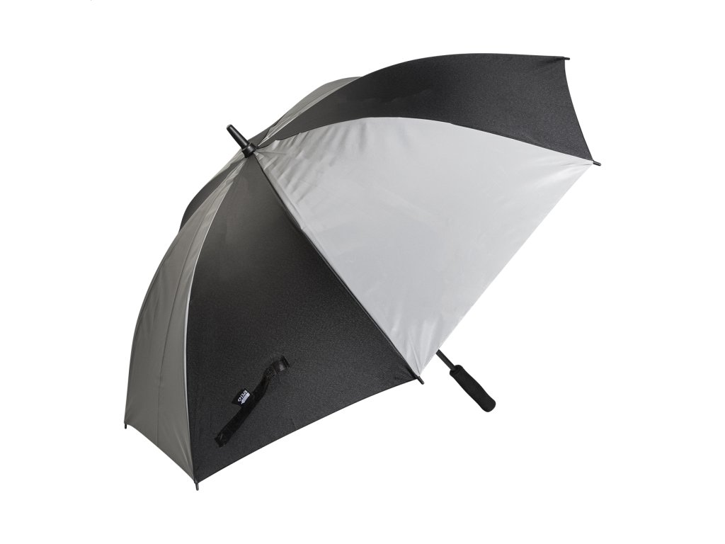 Veľký, manuálny vetruodolný dáždnik so 4 panelmi z 190T RPET pongee a 4 panelmi z reflexnej tkaniny. S celolaminátovým rámom a tyčou, rukoväťou z EVA. 190T RPET pongee. S charakteristickým RPET štítkom.Dodatočné parametre