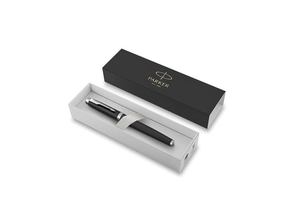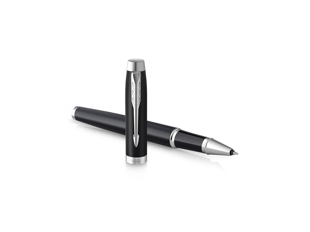 Čierny roller Parker IM Essential má mosadzné telo a viečko s matnou lakovanou povrchovou úpravou v kombinácii s doplnkami pokovovanými chrómom.