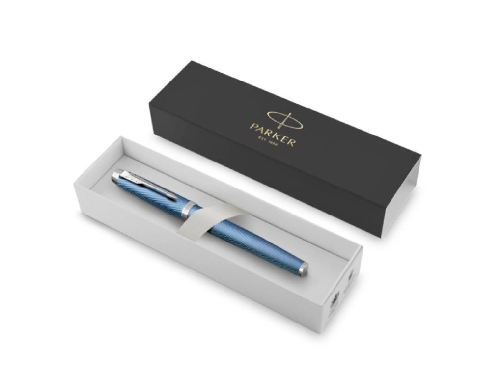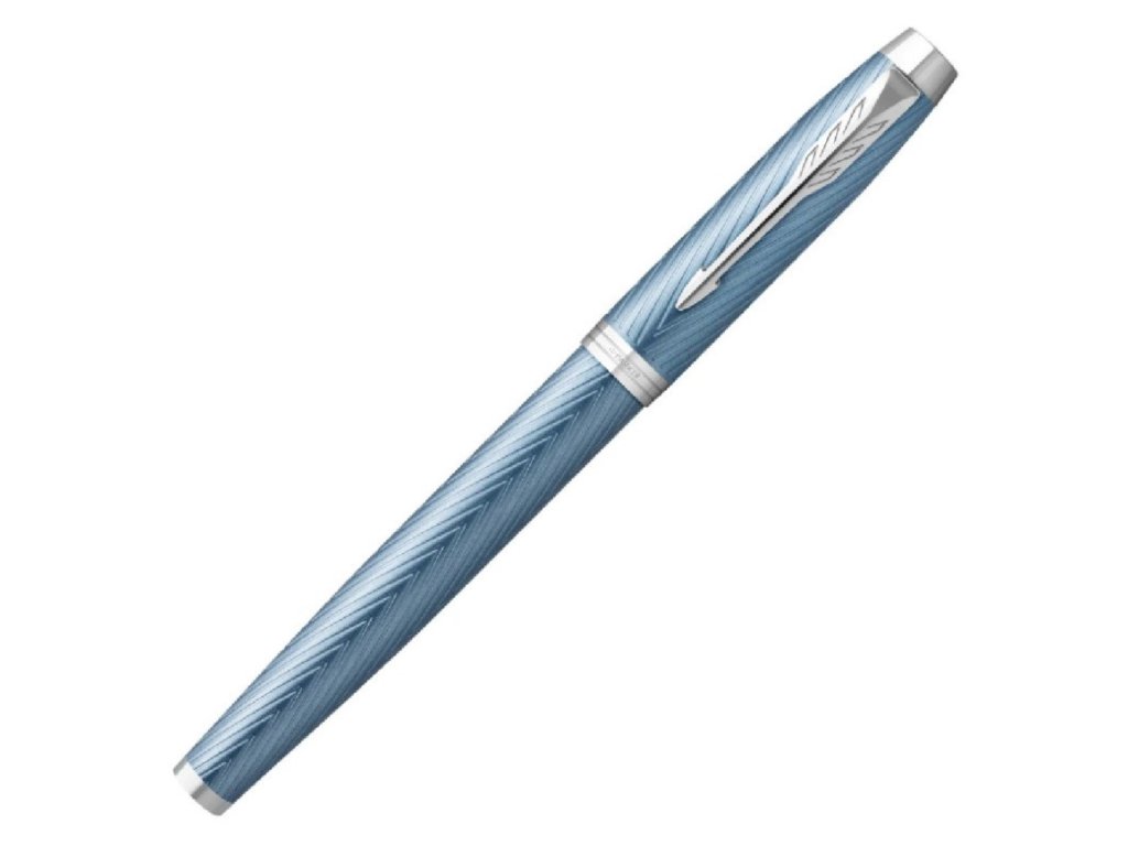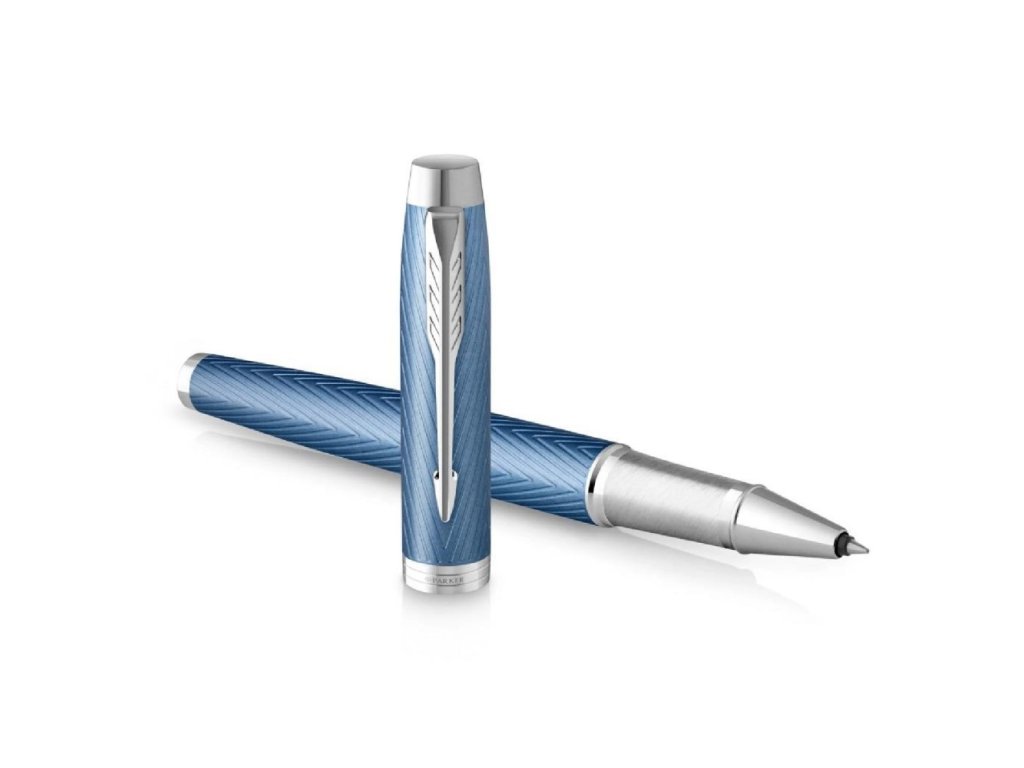 Roller Parker IM Premium Blue Grey CT má lakované mosadzné telo a viečko s reliéfnou rytinou ikonického vzoru chevron, gravírované pomocou laseru v kombinácii s doplnkami pokovanými chrómom.