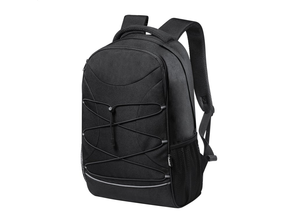 RPET batoh s priehradkami na zips, bočnými sieťovanými vreckami, elastickými šnúrkami vpredu, vystuženým oddelením na notebook (15") a tablet (12"), vystuženým chrbtom a ramennými popruhmi. S výrazným štítkom RPET. Polyester 600D RPET.Dodatočné parametre