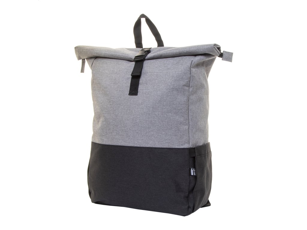 Dvojfarebný rolovací batoh z RPET so zapínaním na pracku, hlavná priehradka na zips, polstrovaná priehradka na notebook (15") a tabliet (10"), bočné vrecká, polstrovaný chrbát a ramenné popruhy. 300D RPET polyester s výrazným štítkom RPET.Dodatočné parametre