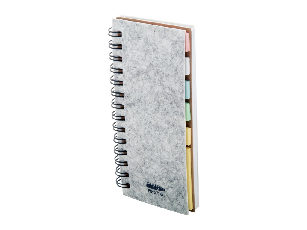 Špirálový blok potiahnutý plsťou RPET so 40 linajkovými listami z recyklovaného papiera, 25 lepiacimi papierikmi a 125 značkami stránok (v 5 rôznych farbách).Dodatočné parametre